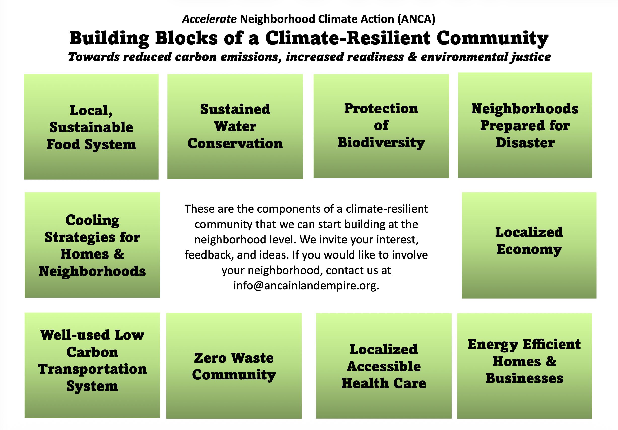 ANCA Redlands, founded in 2022 as a chapter of the national organization, Accelerate Neighborhood Climate Action in Denver, Colorado, is a nonprofit organization that helps build climate-resilient communities neighborhood-by-neighborhood. As an all-volunteer organization, we are deeply concerned about rapidly accelerating climate change and the alarming impacts being experienced in communities worldwide. We believe by working together in the place where we live, we can reduce our carbon emissions that cause the warming, help prepare our communities for severe climate impacts and work for environmental justice.
