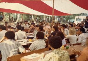 Marriage occured for women usually between 12-15; and most men were married before age 20. Except for a local midwife, medical care required a six-kilometer trip to Tangerang over roads sometimes impassable in the rainy season. Three village units called “kampungs”, Asam, Nurdin and Dahung are bounded on the south by the Islamic Village and facing the rice paddies on the north, west and east. An unpaved road linked the approximately 1500 inhabitants to the major town of Tangerang six kilometers to the north.